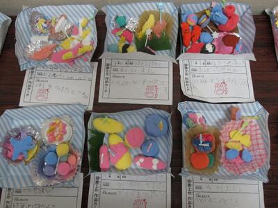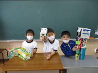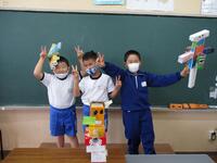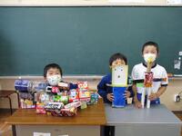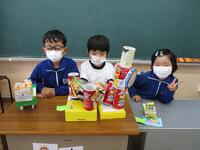 算数の「かたちあそび」の学習で使用したいろいろな箱で作りました。子どもたちは、上手に箱を組み合わせながら、かわいい動物や乗り物を完成させていました。その後、みんなで発表会を行いました。