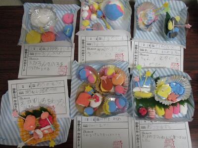 2学期最初の図工は、紙粘土を使って、子どもたちの大好きなごちそうを作りました。赤、青、白、黄色の4色の紙粘土から、2色を混ぜたり絵の具を使ったりして様々な色を作り、食品サンプルのような作品が出来上がりました。紙粘土のふわふわした触感を感じながら、2時間集中して取り組んでいました。