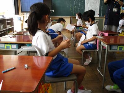 2学期に入ってから、1年生も「山、川・・・」などの漢字の学習が始まりました。子どもたちは、漢字の学習が大好きで、一生懸命に取り組んでいます。そんな1年生が、今日は「100マス作文」に挑戦しました。教頭先生に書き方を教えていただいた後、「好きな食べ物」について好きな理由や食べた時の様子などを文章に表しました。子どもたちは、原稿用紙に書いてある数字を見て、「80字まで書けた。」などと喜んでいる姿が見られました。
