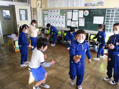 生活科の学習で、昔遊びをしました。羽根つきや竹とんぼ、かるたをしました。初めての遊びもあり、羽根つきや竹とんぼでは上手にできずに苦労している姿が見られました。