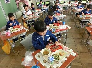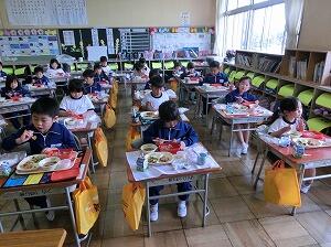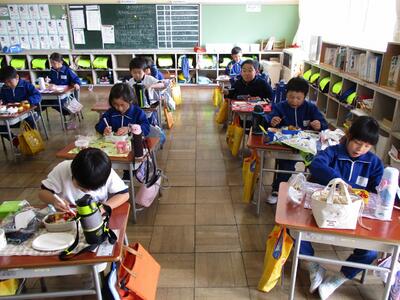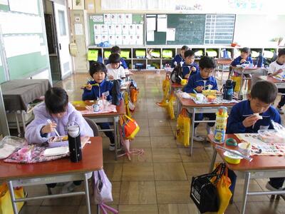 子どもたちは「弁当の日」をとても楽しみにしています。新型コロナ感染症対策のため、前向きで黙食ですが、給食の時とはまた違った表情で食べています。1年間、心のこもったお弁当を作ってくださいましてありがとうございました。