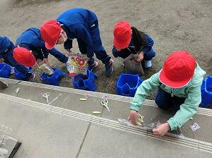 まずは、あさがおの種まきです。一人一人丁寧に土を入れて平らにし4粒まきました。どんな花が咲くか楽しみです。