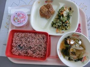 初めての給食は、お赤飯でした。うれしいけれど、ちょっと緊張して食べていました。