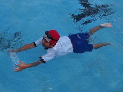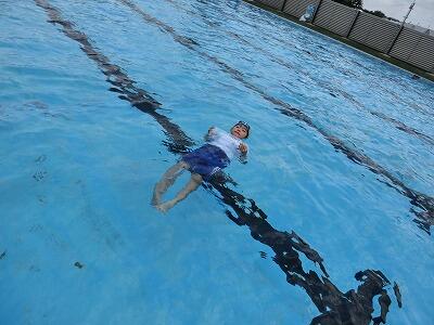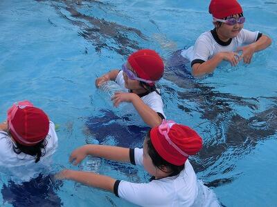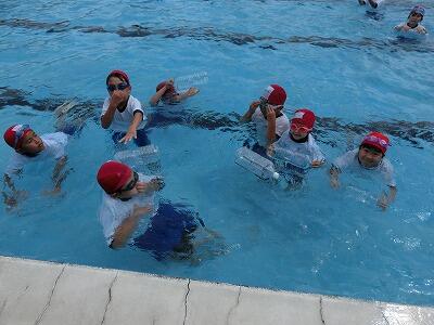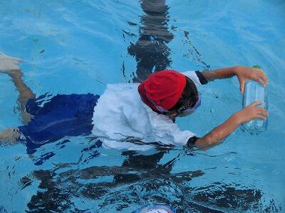 体育の水遊びの時間に着衣水泳をしました。水着の上に夏用の運動着をきてプールに入りました。体が重くなることを実感しました。さらに、家から持ってきたペットボトルを使って、体を浮かせる練習もしました。