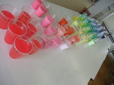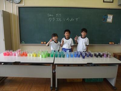 図工で「カラフルいろみず」をやりました。自分で作ってみたい色を4つ作りました。並べて見ると、虹のようにとてもきれいになりました。
