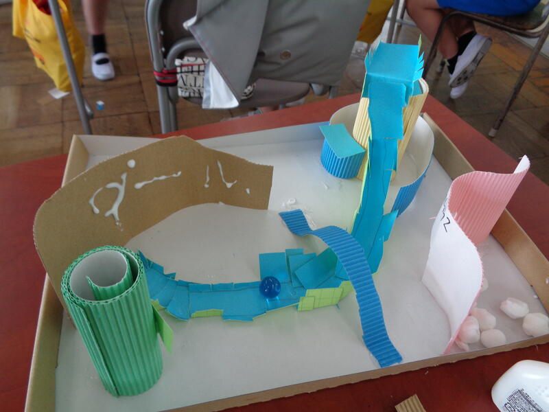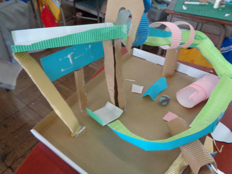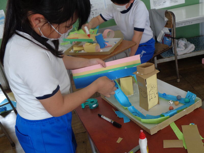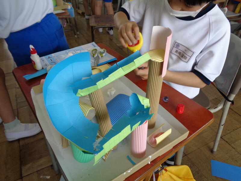 図画工作の時間に、ビー玉を転がして遊ぶコースを作りました。