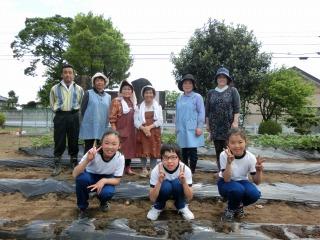 5月11日木曜日、6名の保護者ボランティアの方に来ていただき、農園のうね立て、野菜の苗植えを行いました。くわの使い方のこつも教えていただき協力してうねを立てることができました。