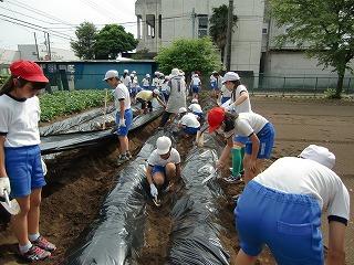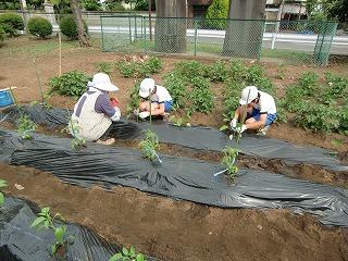 5名のボランティアの方に来ていただき、カボチャ、キュウリ、ナス、プチトマト、ピーマンを植えました。