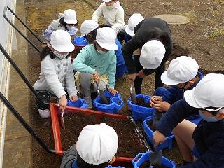 校庭に出て草花を見つけたり、小さな生き物を見つけたり、そしてそれを虫めがねでのぞいたりと、楽しいことばかり!!先日は、花の種もまきました。マリーゴールドにヒマワリにホウセンカです。花の生長やつくりなどについて学習します。ワクワクが止まりません。