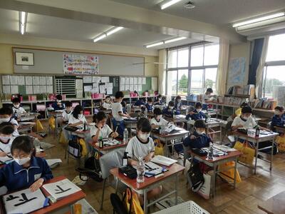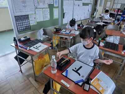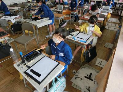 毎週木曜日に書写の授業があります。本日は、毛筆の授業の第4回目でした。毛筆は3年生から始まったので最初は準備や片づけに時間がかかっていましたが、少しずつ慣れて時間も短くなってきました。