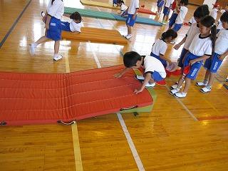 今体育の授業で、マット運動をしています。今日は、前回りの練習をしました。ゆりかごの動きの延長の動きになります。