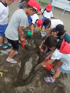 先週、曇り空の日を狙って、砂場で「砂や土と遊ぼう」の学習をしました。全身を使って、