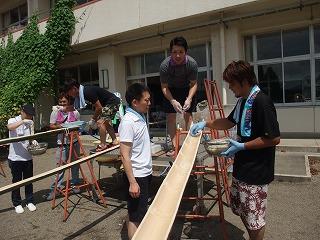 家庭教育学級で流しそうめんをしました。校庭に長い竹を準備してくださいました。