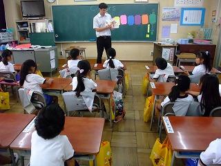 初めての外国語活動(英語)に、みんなドキドキ。オーストラリア出身のダン先生に、自己紹介の仕方を教えてもらいました。みんなで
