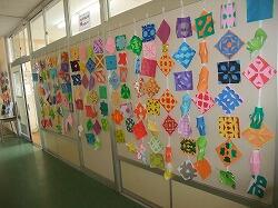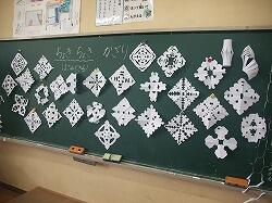 ☆続いて、図工で「ちょきちょきかざり」を作りました。はじめに、白い紙で練習しました。次に、自分で持ってきた折り紙で作りました。丁寧に工夫した模様を作りました。色もきれいです。