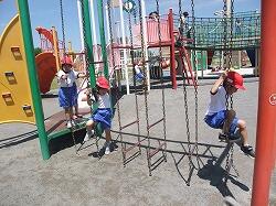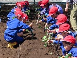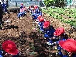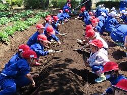 ☆農園活動で、サツマイモの苗を植えました。はじめに、スコップで畝づくりをしました。それから、苗を50本植えました。秋の収穫が楽しみです。