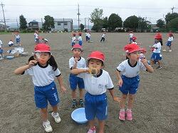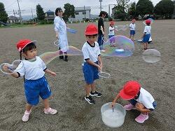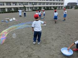生活科のなつとなかよしで、しゃぼんだま遊びをしました。しゃぼんだまが大きくできる液の作り方を、校長先生に教えていただきました。校長先生に作っていただいた液で、2時間楽しく遊びました。モールで作ったもので飛ばしたり、大きな輪で飛ばしたり、ストローで飛ばしたりしました。大きくきれいなしゃぼんだまがたくさんできて、子供たちは大喜びでした。校長先生には、液の材料まで準備していただきました。ありがとうございました。