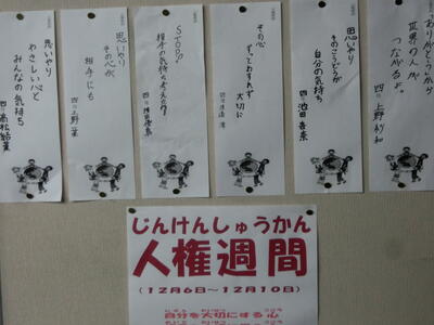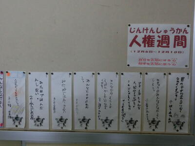 今日から12月10日まで、物部小学校の人権週間です。廊下には、人権に関する標語が掲示されました。明日には、人権集会が開かれます。