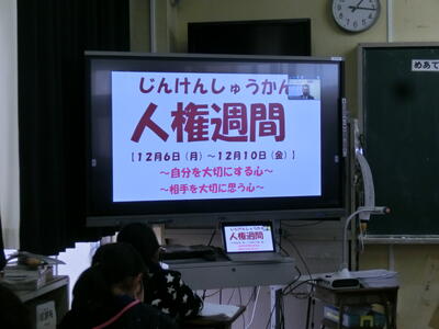 zoomを使い、人権集会を行いました。「人権に関する標語」について、各クラスの代表の発表がありました。その後、人権教育主任によるお話がありました。しっかりと聞くことができました。