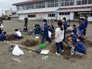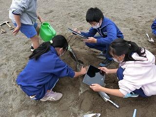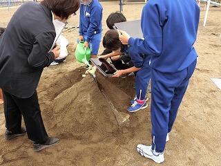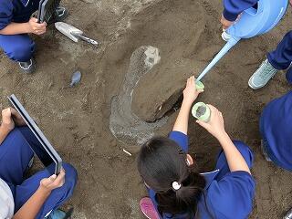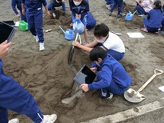 教育実習生の豊田先生と一緒に流れる水のはたらきについて学習しました。
