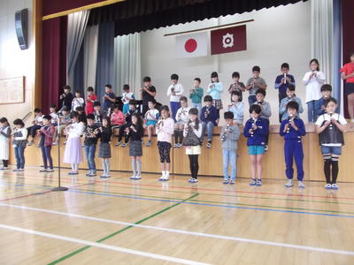 「茶色の小びん」の曲に合わせて、鍵盤ハーモニカとリコーダーを使い、きれいに演奏していました。