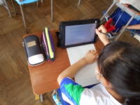 合同な図形の作図の仕方を学習しています。教科書を読んだ後、先生の解説を聞き、作図のポイントを頭に入れました。実際に作図してみて、正しい手順で作図できているかどうか、タブレットパソコンを使って動画を視聴し、確認しています。