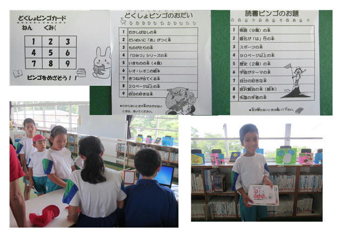 お題に合う本を借りて、「読書ビンゴカード」にハンコをもらって、ビンゴをめざそう!!