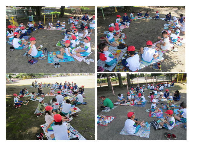 天気も上々、校庭の思い思いの場所で、縦割り班でおいしくいただきました。