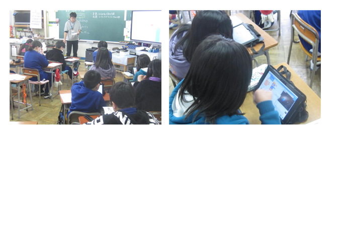 6年2組での学習です。キャラクターや背景を動かすプログラミングで、ゲームを作りました。