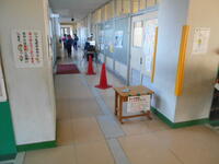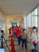 児童の登校の様子を紹介します。教室への入り方を一方方向にし、全員サーモカメラの前を通って教室に入るようにしています。サーモカメラの前では、前髪を挙げておでこを出して検温しています。検温と一緒に元気のよい挨拶ができています。