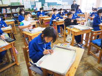 4年2組 木版画 今日から木版画に入りました。彫刻刀の使い方を練習しました。