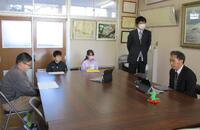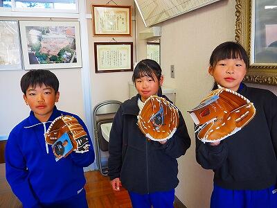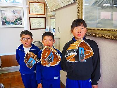 今日は、野球部に入っているのみなさんに、校長室でグローブの質感をたしかめてもらいました。