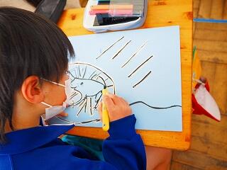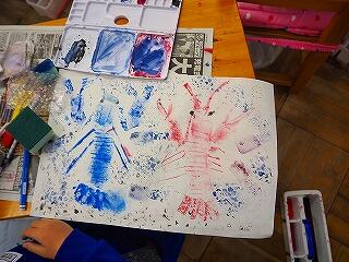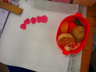 1年生 図工「うつしたかたちから」いろいろな野菜を持ってきて、スタンプにしてすてきな作品をつくりました。