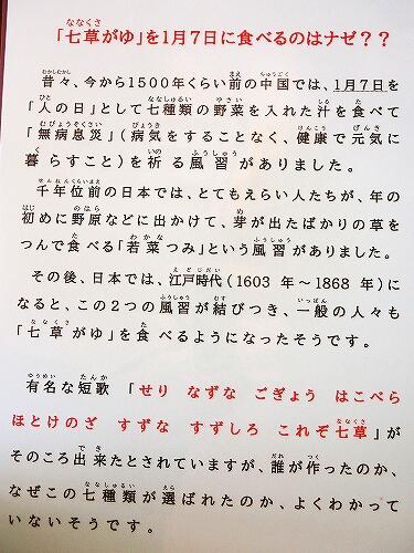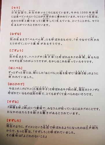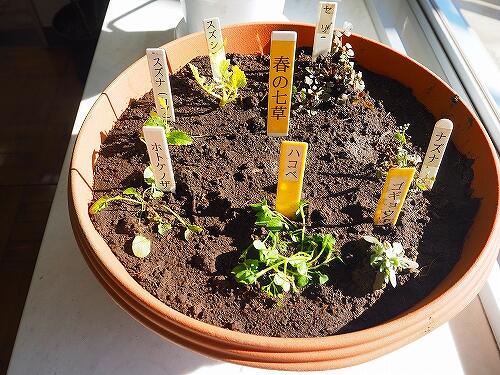 各クラスに展示して、七草に親しみたいと思います。「せり・なずな・ごぎょう・はこべら・ほとけのざ・すずな・すずしろ」が一つの鉢に植えられています。真岡の自然を守る会の皆様ありがとうございました。