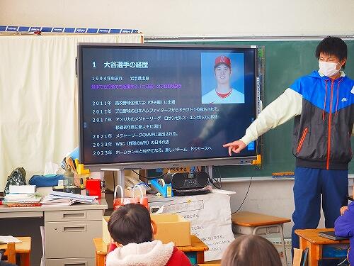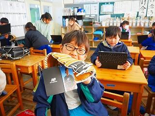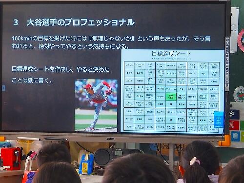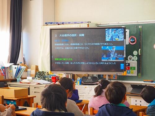 担任の先生が作った「大谷翔平選手のスライド」を電子黒板に映し、大谷選手の説明をした後に、グローブが児童一人一人に配られました。4年生の子どもたちは、うれしそうにグローブを手に取り、重さや感触を楽しんでいました。家族にグローブを見せたいとタブレットPCで写真を撮る子もいました。明日は、高学年教室にグローブが回ります。お楽しみに!!