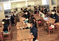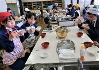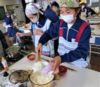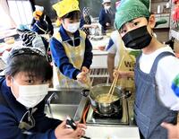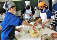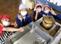 「主食+汁ものを作る」学習として、 ご飯と味噌汁を作りました。味噌汁は、煮過ぎて素材の風味や食感が損なわれないよう 鍋の中の様子を見たり、菜箸で野菜の硬さを確かめたりしました。ご飯は加熱によって「炊けていく」様子を観察するために、透明のガラス鍋を使って調理を行いました。ご飯が丁度よい炊き加減となるようストップウォッチで時間を計りながら作りました。どのグループもおいしくできました。