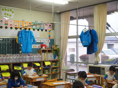 今朝は風雨が強く、歩いて登校してきた児童は、雨に濡れてしまいました。レインコートを着用して登校した子もたくさんいました。教室では暖房をつけたり、濡れたレインコートを乾かしたりして対応していました。