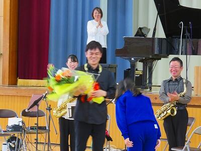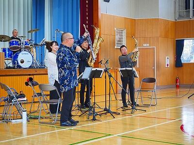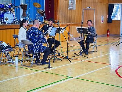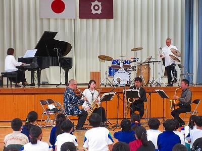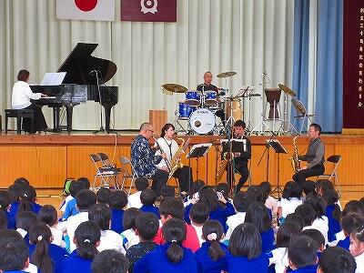林田和之さんが率いる「ハヤシダ・ファミリア」のメンバーが長田小に来て、すてきな曲を演奏してくれました。ソプラノサックス、アルトサックス、ティナーサックス、バリトンサックス、ピアノ、ドラムの6名のメンバーです。午前の部が下学年、午後の部が上学年と2回に分けて演奏しました。林田和之さんは、久石譲さんのコンサートやレコーディング、ツアーにも多数参加されているプロのミュージシャンです。大学で客員教授として学生の指導もしているそうです。楽しい曲をたくさん演奏していただき、音楽を楽しむことができました。今日演奏してくれた曲は長田小校歌を含め13曲でした。乗りのいい曲に体を踊らせていた子もたくさんいました。「ハヤシダ・ファミリア」のみなさん、ありがとうございました。