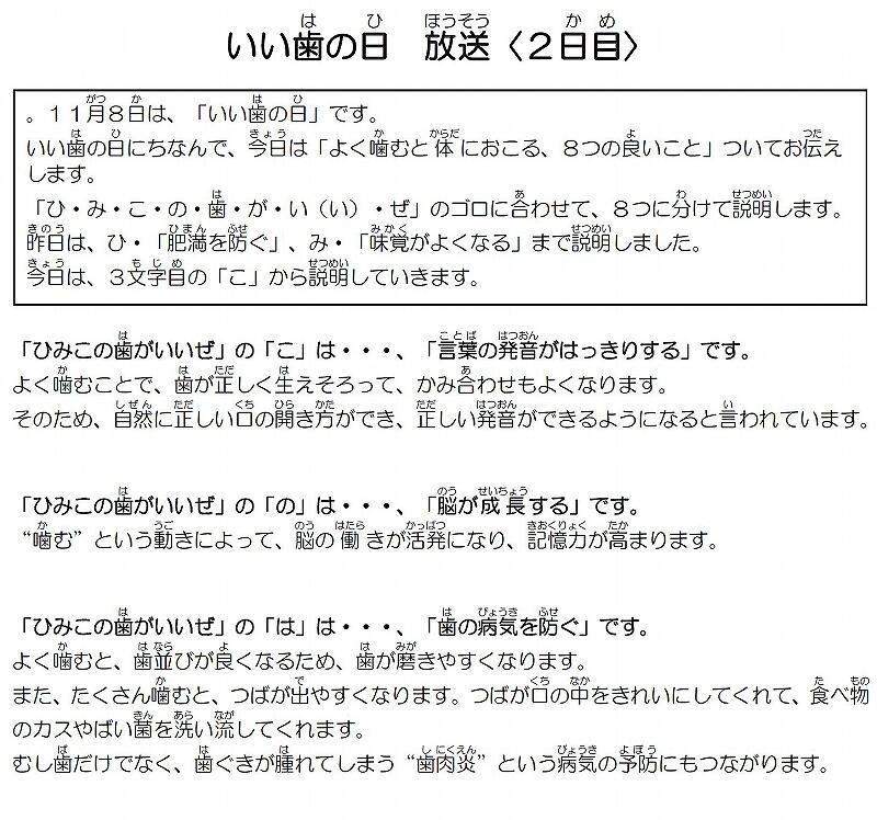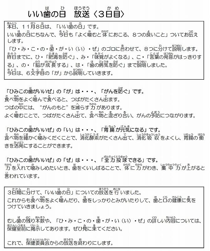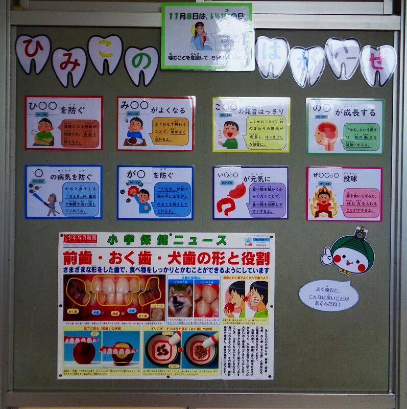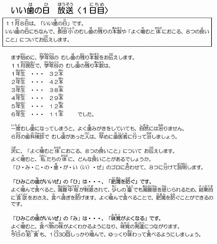 11月8日は「いい歯の日」です。いい歯の日にちなんで、長田小のむし歯の残りの本数や「よく噛むと 体におこる、8つの良いこと」について給食の時間に保健委員が放送しました。