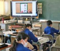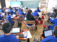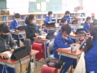 歴史の学習をしています。電子黒板では、古代日本の政治や文化が大陸の影響を大きく受けていることをアニメーションで学び、その他に調べたいと思ったことを 一人ひとりがタブレットパソコンを使って検索し、調べています。