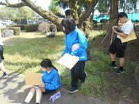 晴れやかな青空の下、校庭にどんな生き物がいるのか、どんな場所にいるのか調べてきました。