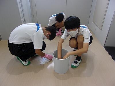 中村中は、「一隅清掃」として、生徒が自らの意思で隅々まで清掃する活動を伝統的に取り入れています。下の写真は、そのシーンの一つです。1年生がトイレの床や便器を、丁寧に拭き取っていました。トイレはもちろんピカピカになりました。しかし、それ以上にきれいだと感じたのは生徒たちの心です。諸先輩方が築き上げた「一隅清掃」は、中村中生徒の心に浸透しているようです。