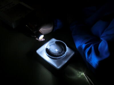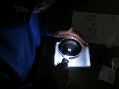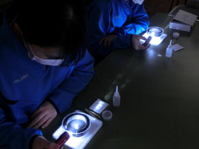 天然石から出てくる放射線の飛跡を観察する様子です。生徒からは、「オーッ」感動の声があちこちから聞こえてきます。