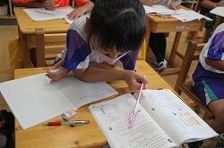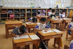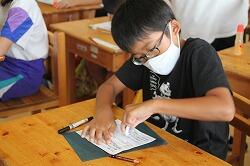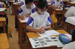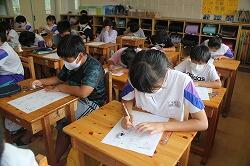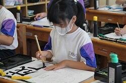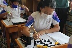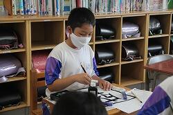 5年生にもなると画数の多い漢字を書きます。今日の書写では、一画目と二画目の始筆が同じときはどのように筆を入れるか学習しました。点画のつながりを考えながら練習しました。