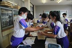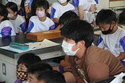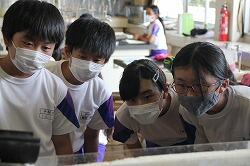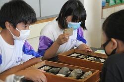 子どもたちは興奮状態。さらに、みなさんも修学旅行でできるんだよの話に大喜び。その後、興味深く化石の標本を観察しました。
