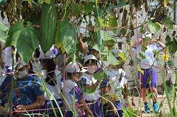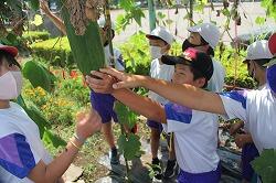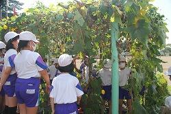 最初に、ひょうたん へちまの観察をしました。葉が大きくなり、たくさんの実をつけ始めていることに驚きました。