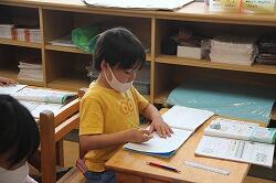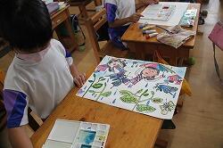 図工では、彩色を行いました。絵の具からの単色は使用せず、2つ以上の色を混ぜ合わせて色を作っていきます。「茶色はどう作りますか?」などとの質問があり、担任がアドバイスしていきました。混ぜ方により色の濃淡が変わります。その絵に合った色を考えながら作り出し、塗っていきました。