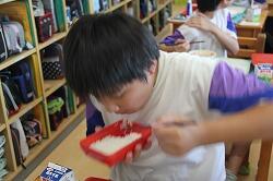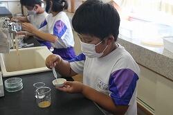 要は、火山灰の周りについた粘土質の土やごみを洗い出していく作業です。一回ごとに、すすぎ水を捨てていくと、椀の中に火山灰が残っていきます。最初は黒だけかと思っていた子どもたちも白いものが多数見え、驚きでした。