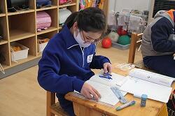 算数は、少人数指導で「正三角形、二等辺三角形の特徴」について学習しています。今日は、その特徴を基に、コンパスを用いて作図の学習を行いました。