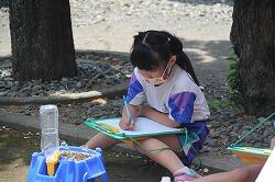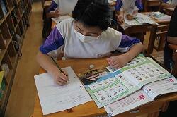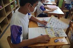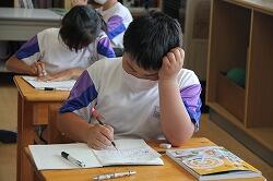 書写は毛筆の学習を行いました。今日は、筆の持ち方、使い方を学習した後、実際にいろいろな線を書きました。力の入れ具合によって太さ、勢いが変わることを体感しました。